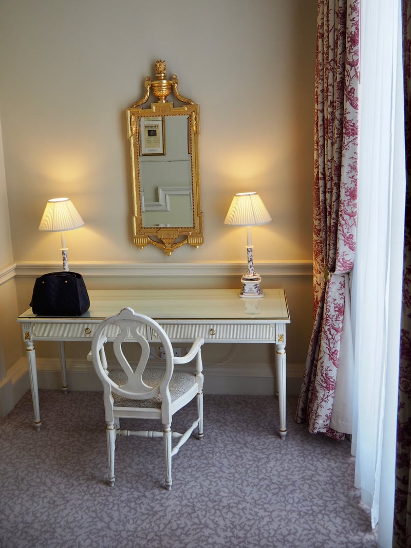 The 123 rooms and 19 suites are divided between the main house and the more recent garden wing. The elegance and history of these 18th century mansions shine through the rooms' interior design. We stayed in a gorgeous junior suite, and I must admit that my jaw dropped as soon as we entered the room, with its beautiful high ceilings, majestic bed, impressive chandelier, decorative wall molding—in short, the luxury of days gone by! Spacious, comfortable, and highly refined, the suite displays a rather feminine atmosphere with accents such as beautiful pink toile.