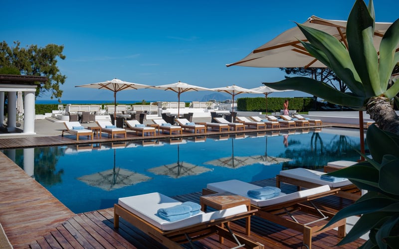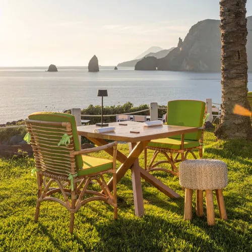 Golden yellow Aeolian houses scatter through lush gardens at this Salina retreat, their terraces opening onto sweeping island panoramas. The intimate pool rewards slow, contemplative laps rather than energetic splashing—a telling detail about the property's grown-up sensibility. Private boat excursions explore the archipelago's volcanic coastline, while evenings bring gourmet cocktails and housemade delicacies. Ideal for couples seeking meditative seclusion.