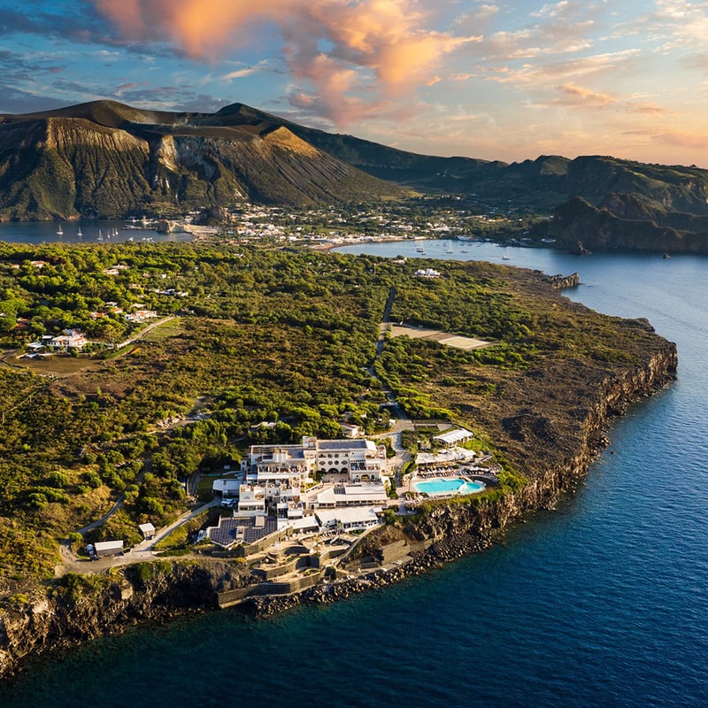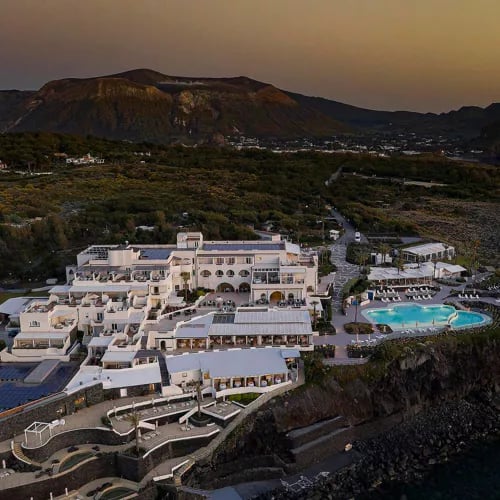 Volcanic black sand and dramatic Aeolian landscapes frame this 70-room retreat on Vulcano's northern edge, where cascading saltwater infinity pools survey Lipari across the narrow strait. The resort holds a rare distinction among Italian hotels: two Michelin-starred restaurants, Il Cappero and I Tenerumi, both celebrating Sicilian seafood. Three private black-sand beaches, a lavish spa with Turkish bath and sauna, and on-site cooking lessons complete the picture.