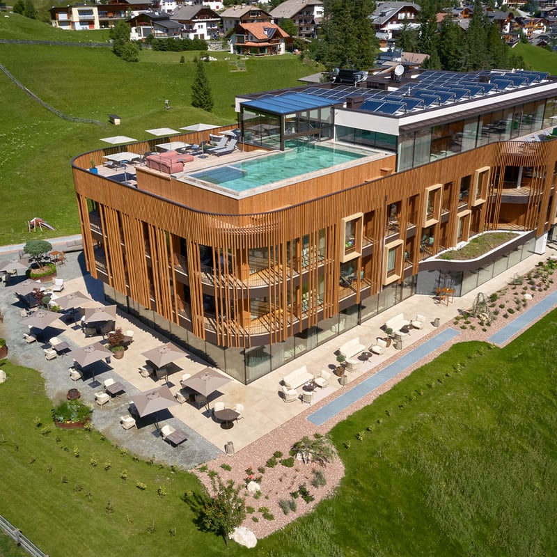 Modern Alpine architecture clad in warm wood rises dramatically above the Ladin village of Badia, its 33 rooms and suites opening onto mountain-facing balconies with select accommodations featuring private saunas. The rooftop spa commands the finest views—an infinity pool framed by Dolomite peaks. Adults-only and design-forward, Badia Hill pairs minimalist interiors with serious gastronomy at Porcino, its gourmet restaurant reflecting the owners' wine expertise.