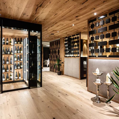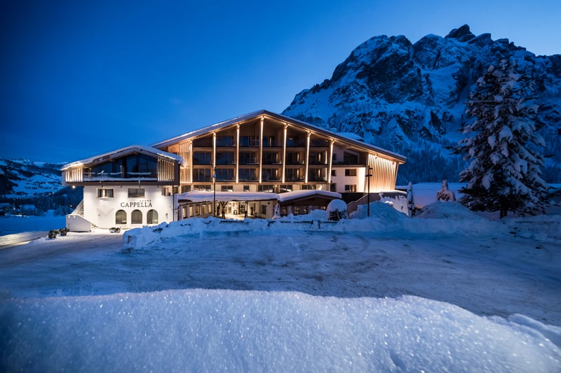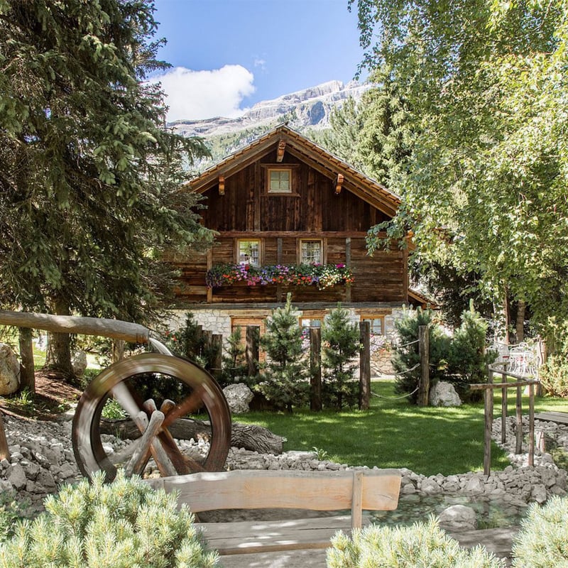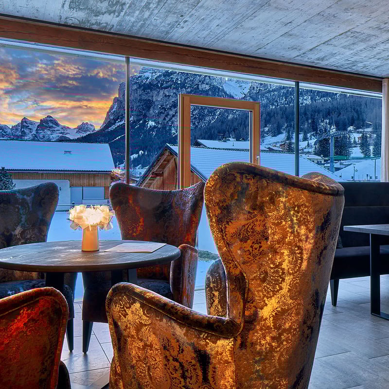 A classic Alpine lodge meets its chic contemporary counterpart at this 48-room boutique property in Val Badia, where floor-to-ceiling windows pull the Dolomite panorama into every space. Winter guests step out to Alta Badia's ski lifts within minutes; year-round, a substantial spa complex—sauna, steam room, Turkish bath, indoor and outdoor pools—rewards the active. Evening dinners unfold beside a wood-burning fireplace, wines drawn from the hotel's own cellar.
