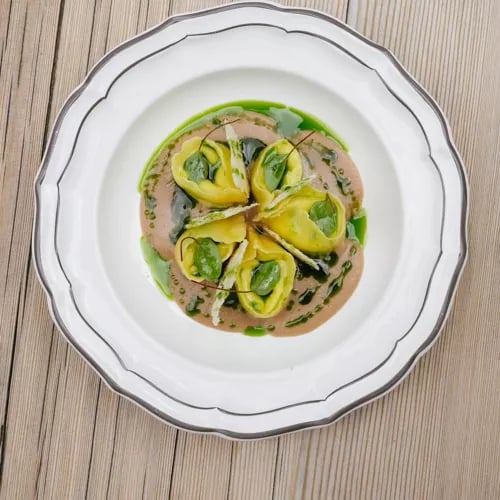 An 18th-century farmhouse deep in the woods of Alta Badia, Maso Runch-Hof serves a single tasting menu of Ladin home cooking in traditional Stube dining rooms lined with aged wood. The generous portions — cajinci t'ega spinach ravioli, slow-cooked pork ribs with polenta, apple strudel — arrive alongside wines drawn exclusively from Alto Adige vineyards. A meal here feels like stepping into another century.