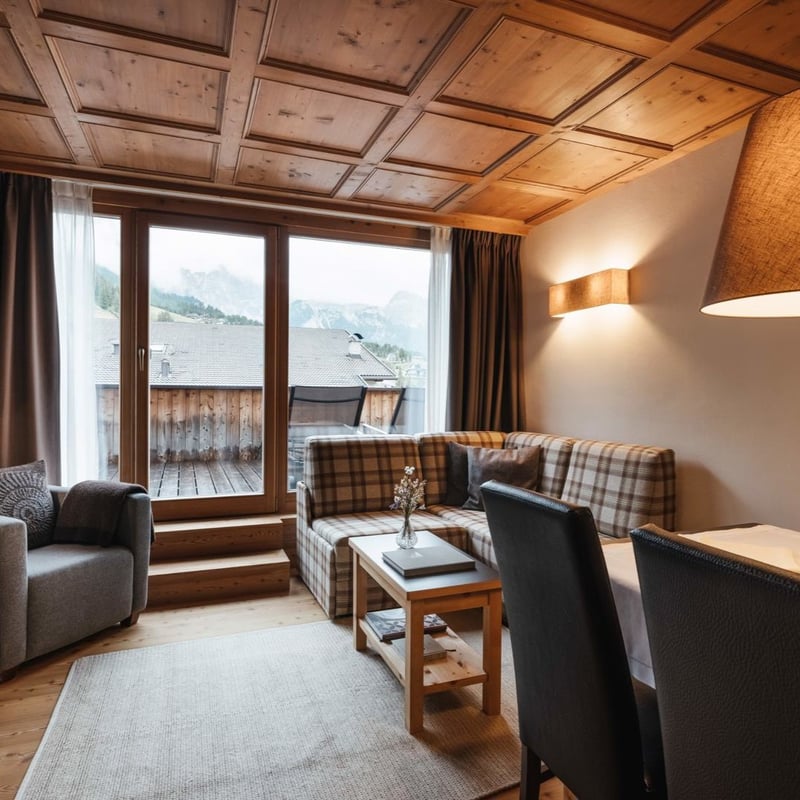 Clean modernist lines meet knotty pine paneling and abstract cowhide-inspired rugs across twenty-four apartment-style residences, each with full kitchens and panoramic windows capturing the Dolomite peaks. The recovery-focused spa—complete with hammam and sauna—targets post-ski restoration, while a partner restaurant delivers directly to rooms, ideal for travelers seeking Alpine warmth without sacrificing contemporary sophistication.