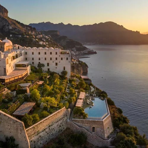 An 11th-century palazzo crowning Ravello's cliffs, the Caruso preserves medieval frescoes and stone lions at its entrance while delivering one of the coast's most photographed vistas—Gore Vidal called it the world's most beautiful view. The heated infinity pool dissolves into sea and sky, terraced gardens cascade down the hillside offering private tours with the head gardener, and Villa Margherita provides secluded suites with butler service for those seeking absolute privacy.