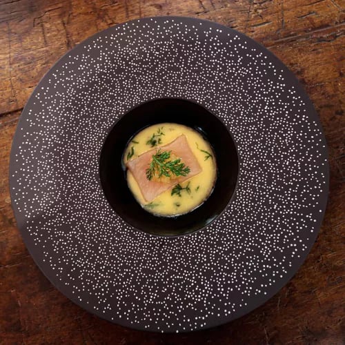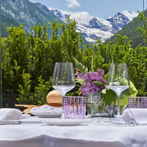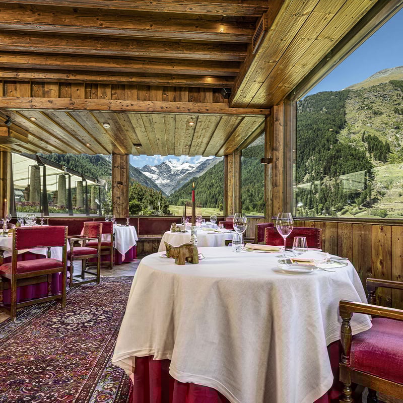Five tables compose this Michelin-starred dining room, two commanding views of the valley's dramatic sweep toward Gran Paradiso's glaciated peak. Tuscan chef Niccolò de Riu roots his cooking firmly in Valle d'Aosta tradition—char, roe deer, mountain herbs—while sommelier Rino guides guests through a cellar spanning Georgian orange wines to Japanese bottles. Fifth-generation maître Pietro orchestrates the intimate service with familial precision.