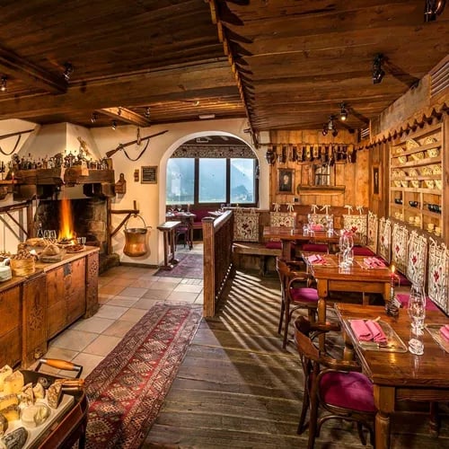 This intimate Stube-style dining room wrapped in warm wood paneling celebrates the Aosta Valley's pastoral heritage through a cheese-centric menu. The fondue draws particular acclaim, though the kitchen extends its contemporary Italian approach across traditional regional preparations. Staff dressed in local costume reinforce the alpine authenticity, creating an atmosphere both refined and rooted in mountain culture.