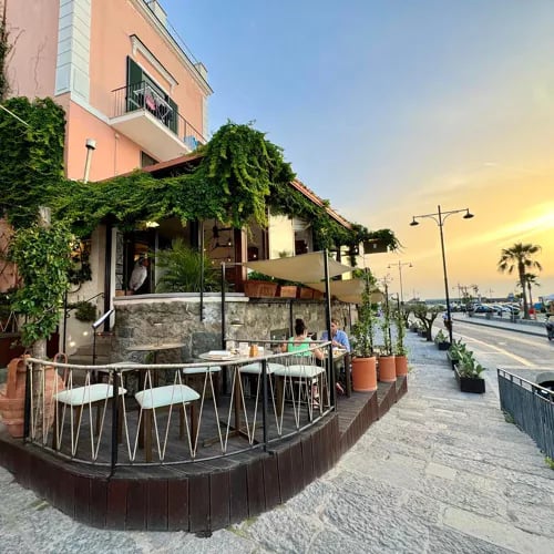 A romance between an American visitor and a Forio local gave birth to this port-side institution, where a vine-shaded veranda frames views across the Tyrrhenian. The kitchen champions hyperlocal Ischian tradition: pasta tossed with rare zampognaro beans, mussels, and squid; rabbit braised in the island style and presented in rustic terracotta. Serious regional cooking for those seeking Campania's authentic table.