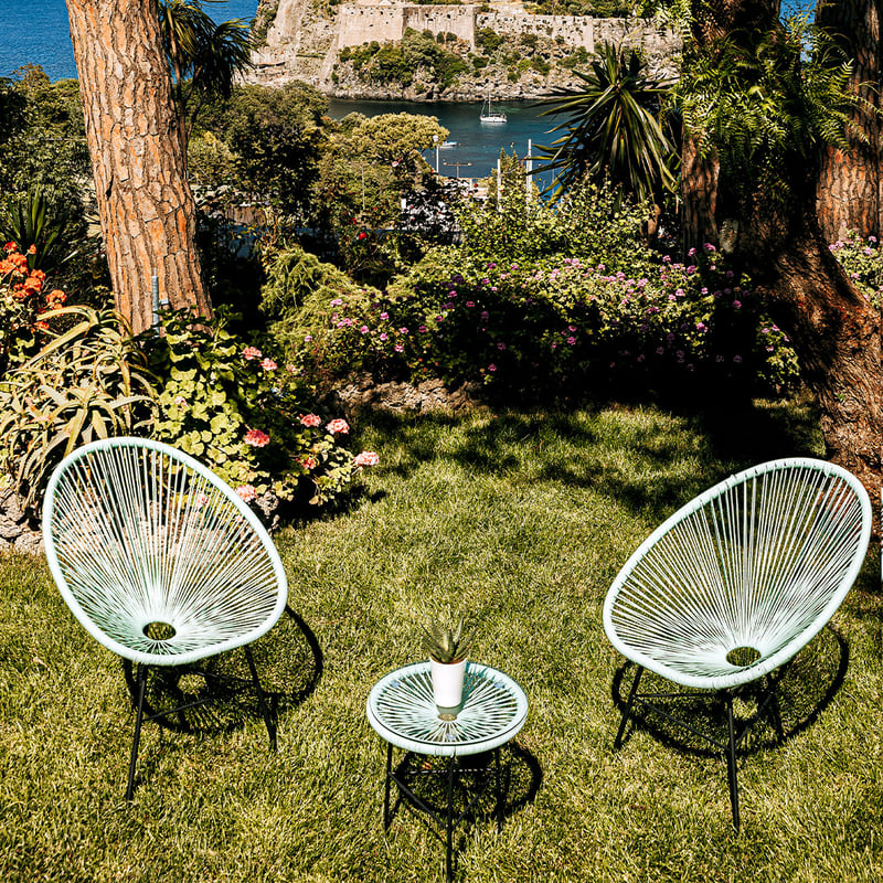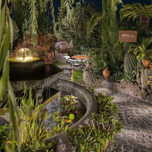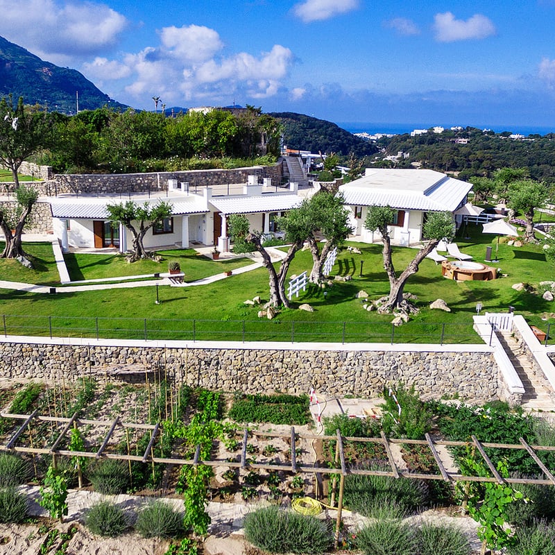 Forty rooms dispersed across nine villas create an intimate village atmosphere within Botania's two-acre garden estate on Ischia's western coast. The thermal heritage runs deep: natural hot spring baths complement a full spa circuit of Turkish bath, sauna, and jacuzzi. Three restaurants serve distinct purposes—Il Corbezzolo for local seafood, vegetarian Il Mirto drawing from the organic garden, and Nonna Marì's Kitchen for cooking classes in Southern Italian tradition.