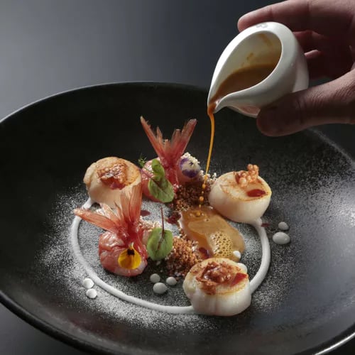 Materia holds one Michelin star for its bold Italian-Asian fusion, a kitchen driven by vegetables, aromatic herbs, and spices that yield dishes of startling intensity. The approach favors challenging flavor profiles—acidic, bitter, deliberately unconventional—exemplified by pickled whitefish paired with roe and sharp local greens. A lighter lunch menu offers accessibility, though dinner rewards those seeking concentrated, boundary-pushing gastronomy on Lake Como's shores.