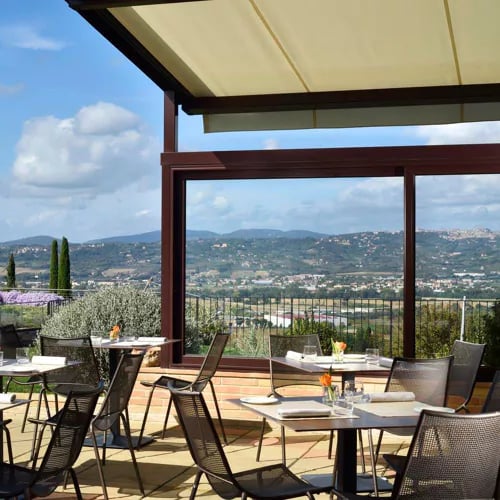 Perched above the Umbrian hills near Torgiano, Quattro Sensi commands sweeping views of Perugia from its glass-enclosed veranda—an ideal setting for leisurely afternoon meals. The kitchen channels regional traditions through contemporary technique, with dishes like pappardelle dressed in Cinturello Orvietano pork ragù brightened by orange and fennel. An elegant interior dining room accommodates more formal occasions.
