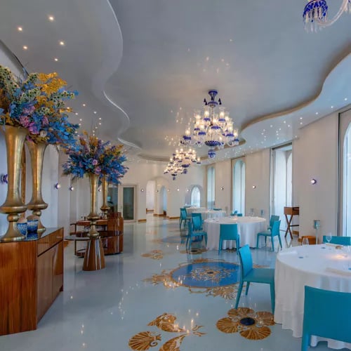 Mosaic floors and Venetian chandeliers fill the first-floor dining room of Palazzo del Suono del Mare, where tall windows frame the Adriatic coastline below. The kitchen holds a Michelin Plate for its contemporary reworking of Puglian traditions—expect regional ingredients treated with inventive technique. A panoramic terrace extends the experience outdoors, ideal for long summer evenings above the sea.