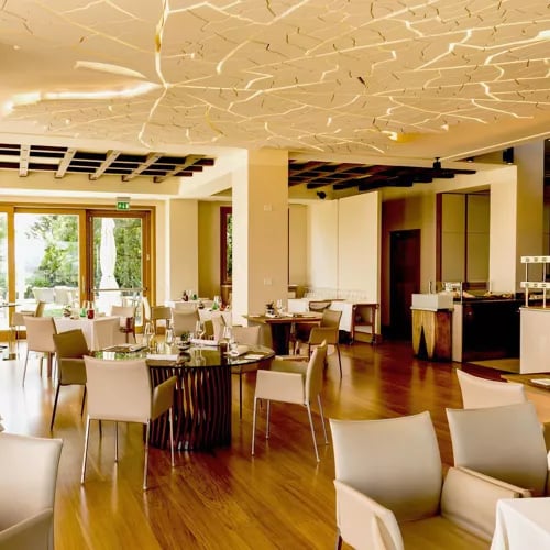 Expansive glass walls and pale Noto stone give this 32-room golf resort a luminous, contemporary character. Rooms feature oversized soaking tubs, while the spa complex offers a sauna, jacuzzi, and Turkish bath for post-round recovery. Two pools—one indoor, one seasonal outdoor—complement a Mediterranean restaurant serving lighter midday fare. A polished retreat for golfers and wellness seekers alike.