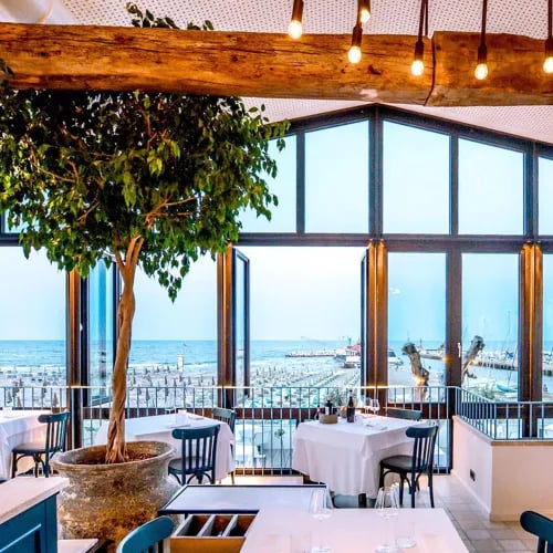 Inside a private beach club on the Romagna coast, Maré surprises with refined seafood served steps from the sand. The dining room frames a classic Italian beach scene—rows of umbrellas stretching toward the Adriatic. A signature dish of monfettini pasta, mantecato-style with cuttlefish, clams, mantis shrimp and ink, arrives with risotto-like creaminess. The champagne list rewards those who linger past sunset.