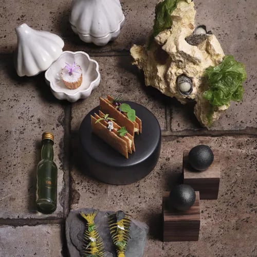 A converted 1970s cistern perched above Andora, Vignamare rewards the winding drive with vineyard-framed sea views and Alessandro Di Giacomo's one-starred cooking. The Caserta-born chef draws almost entirely from PEQ Agri's own gardens, applying refined Mediterranean technique to Campania-inflected dishes—courgette alla scapece, tortelli alla genovese. Seven or nine courses unfold on the panoramic terrace; a fully vegetarian tasting menu earns the Green Star distinction.