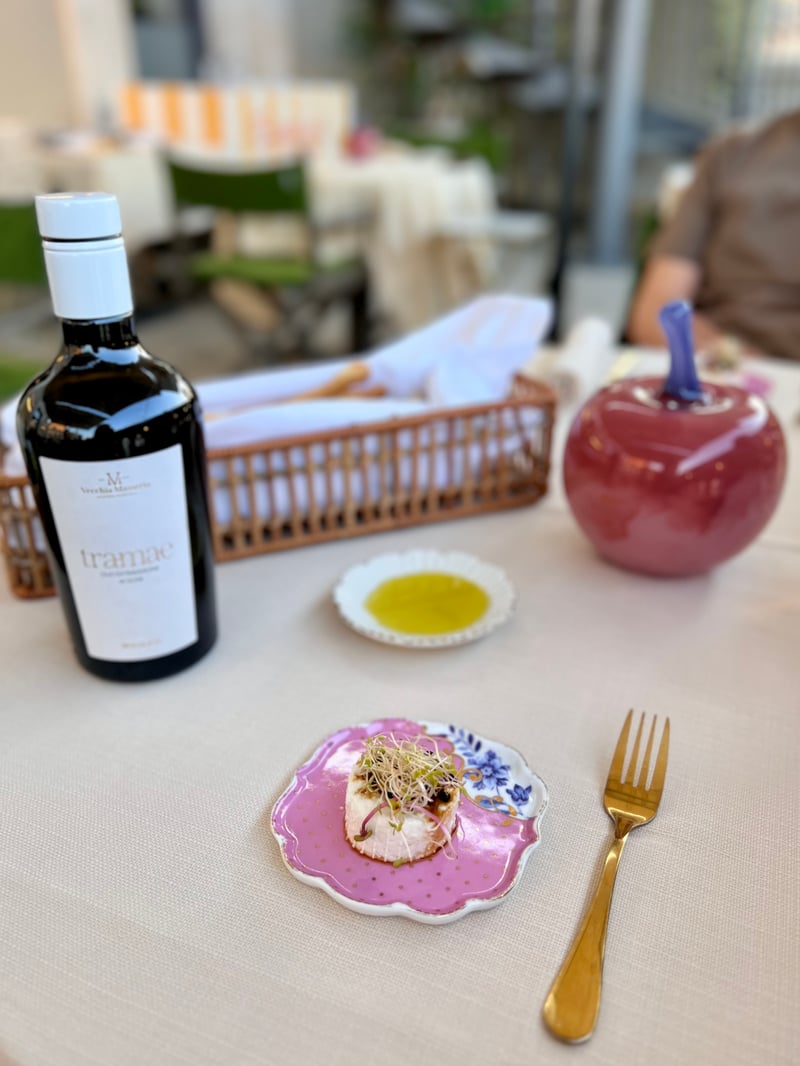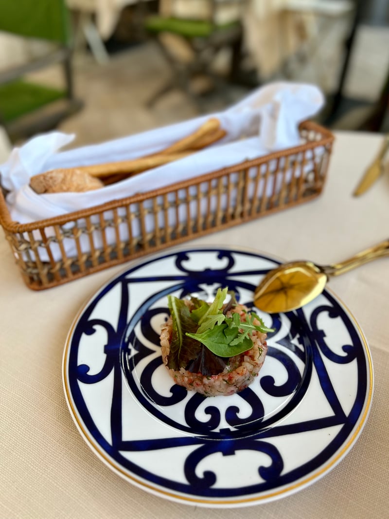 Our dinner began with a red shrimp tartare from Mazara del Vallo, a Sicilian specialty renowned for its delicacy and sweetness. Presented as a delicate cylinder, the tartare was subtly enhanced with wild fennel and a touch of lime, then topped with young salad shoots for a fresh note. This dish elegantly combined Mediterranean authenticity and contemporary refinement.