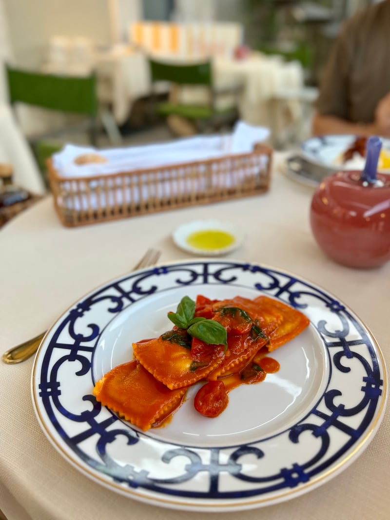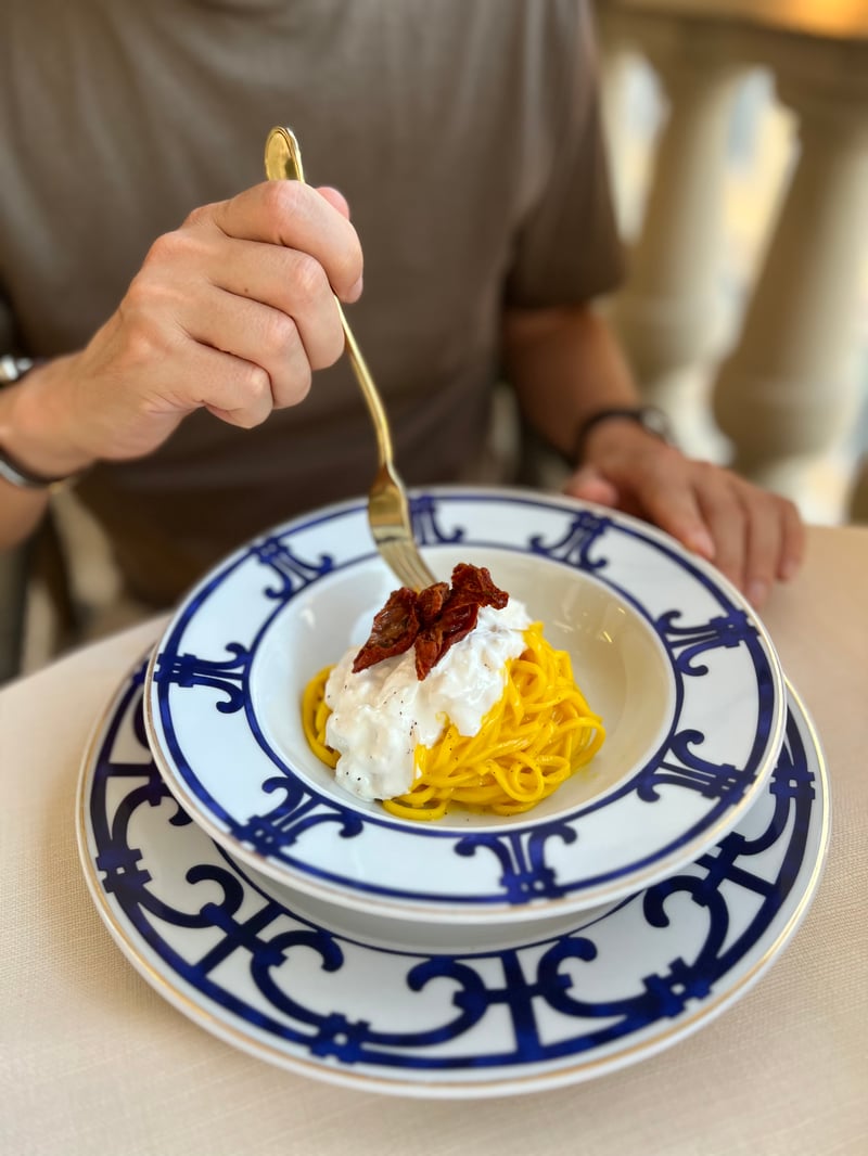 We then continued with ricotta and spinach ravioli, whose golden pasta enclosed a creamy, delicate filling. Topped with a lightly candied cherry tomato sauce and infused with fresh basil, these ravioli perfectly embodied the elegance of traditional Italian cuisine. Simple and refined, they paid tribute to the richness of local products in a bright and sunny dish. My husband chose the saffron-scented tagliolini, with a vibrant color and silky texture. Their creaminess was elevated by generous buffalo milk stracciatella, bringing softness and balance to the intensity of the spice. The sun-dried tomatoes used as garnish added a sweet and tangy depth of flavor.