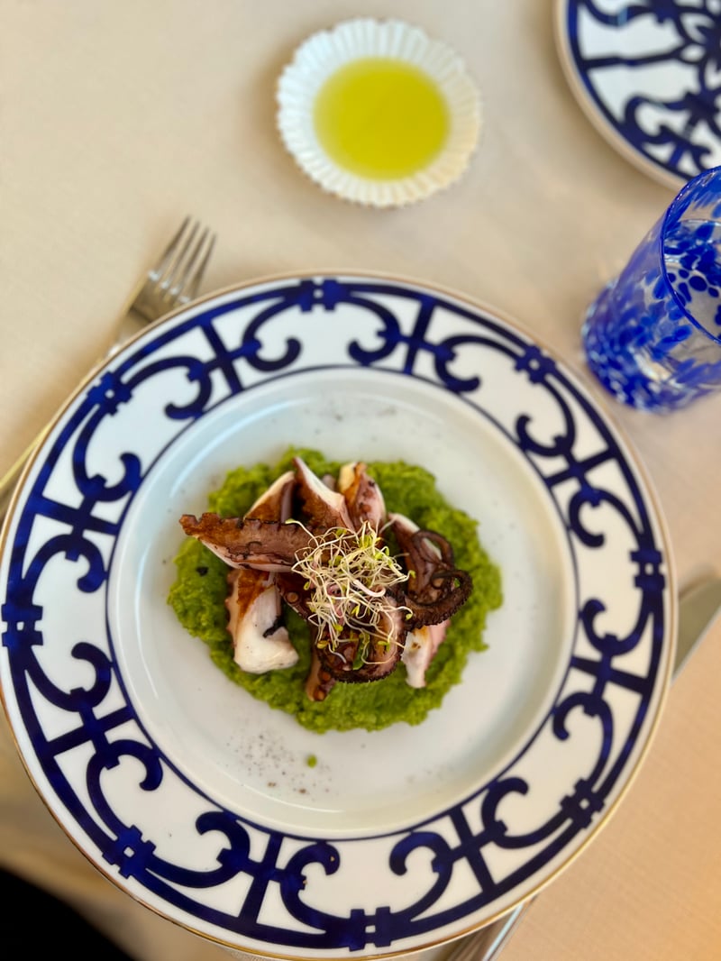 The journey continued with roasted octopus, tender and slightly caramelized. Placed on a bed of smooth green pea hummus, enhanced by a touch of Roman mint, it offered a beautiful harmony between intensity and freshness. Some sprouted shoots completed the plate, adding lightness and elegance to a dish with resolutely Mediterranean accents.
