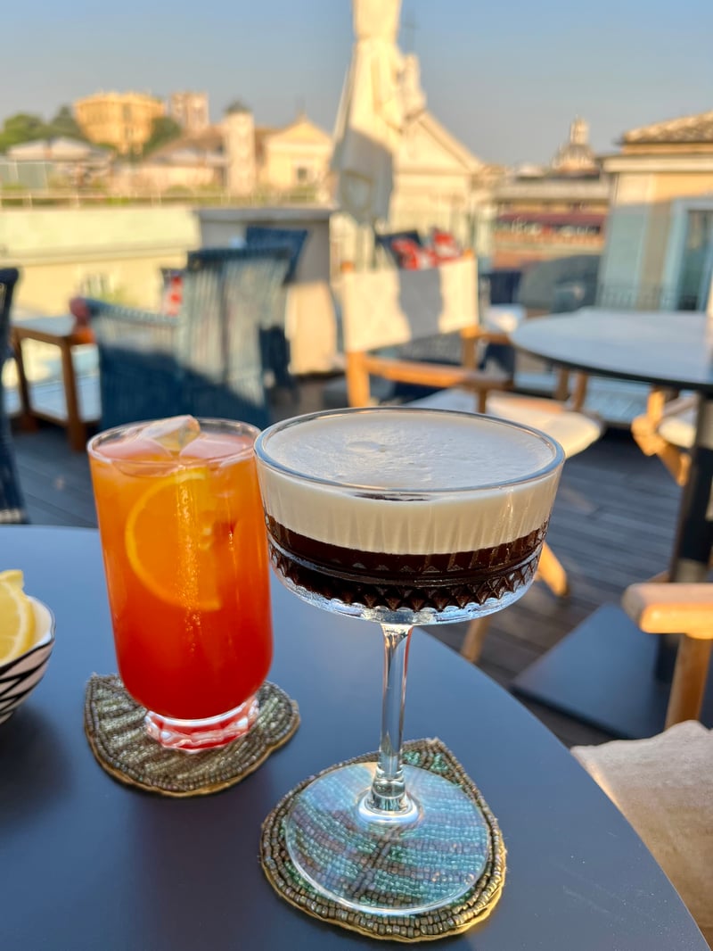 Nestled in the heart of ancient Rome, the Singer Palace Hotel occupies the former Singer Palace, a prestigious building constructed in 1930 by architect Mario Loreti for the famous Singer Corporation. This historic building stands out for its spectacular marble staircase, gracefully curved metal railings, and bakelite details typical of the era, giving it a timeless charm. Today, the hotel elegantly blends the splendor of its original architecture with a contemporary design inspired by the colors of Rome. Its refined rooms, decorated with fine Italian fabrics, wooden parquet floors, and delicate mosaics, offer a warm and sophisticated atmosphere, both intimate and unforgettable. It is in this exceptional setting that we came to discover their Jim's Rooftop Cocktail Bar and Le Terrazze restaurant.