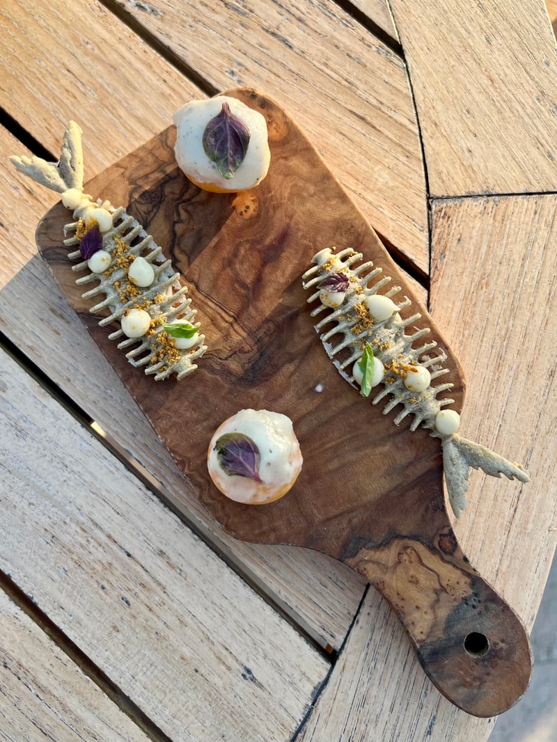 Our dinner at NOTOS began with two signature mocktails, each with a distinct identity. The Velvet Brew for my husband, with its rich and robust flavors, envelops the palate in a soft and silky texture, blending espresso, orgeat, almond milk, and a hint of cinnamon. Fresher and more sparkling, I chose the Vitae Vigor, which proved to be a revitalizing elixir infused with lemon verbena, uplifted by honey and citrus, and animated by a light bitterness evoking a spring breeze.