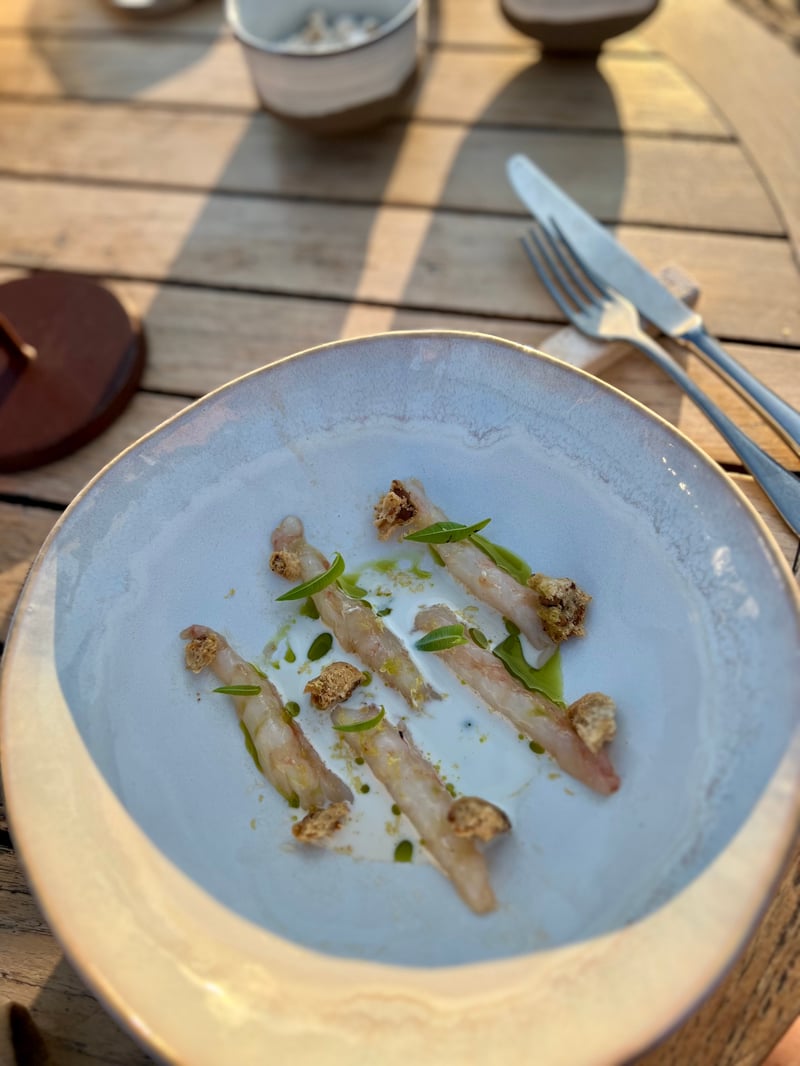 We then chose the Menù Intuizione, a formula that allows you to create a personal journey through four à la carte dishes. The first, a scampi carpaccio, was a plate of great visual and gustatory purity: the raw flesh, delicately translucent, was enhanced by the crunch of Neapolitan tarallo, the milky sweetness of stracciata di bufala, and the aromatic freshness of tarragon. It's a dish that perfectly expresses the Mediterranean spirit: light, refined, and built around a harmony of textures and flavors, with a contemporary aesthetic that highlights the sophisticated simplicity of the ingredients.