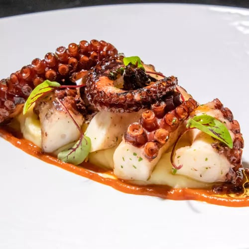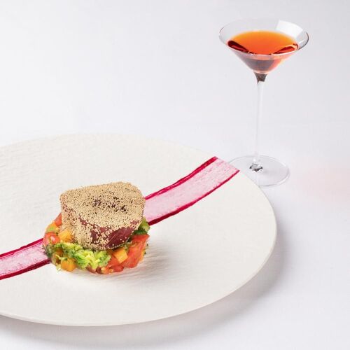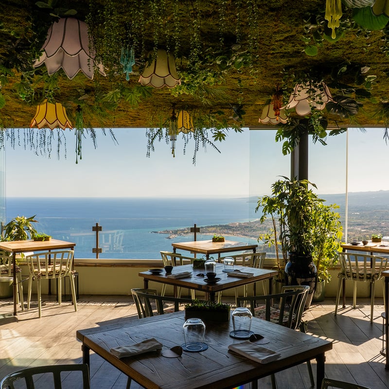 Eight tables on a bougainvillea-draped terrace, the Bay of Naxos and Etna's silhouette spread below—this is the stage for Roberto Toro's one-Michelin-starred Sicilian cuisine. His signature spaghetti with roast peppers, prawn, sesame, and lime captures the chef's contemporary approach to island tradition. A 400-label cellar favoring small local estates completes an evening of understated refinement.