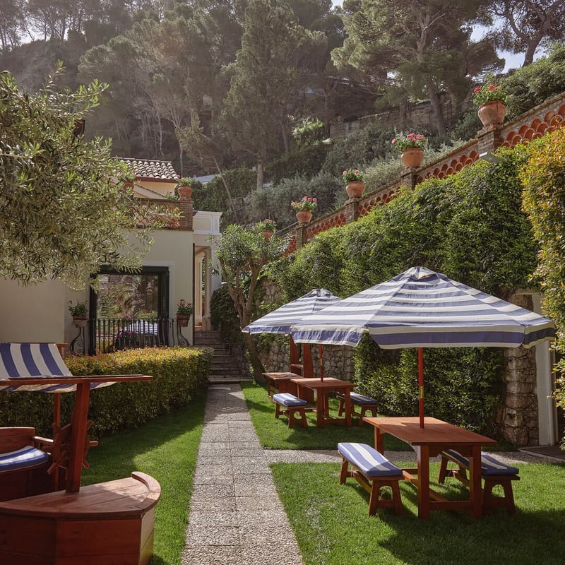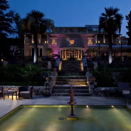 A British colonel's clifftop villa turned twenty-four-room retreat, The Ashbee bears the signature of Arts and Crafts architect Robert Charles Ashbee in its luminous white interiors and eclectic antique furnishings. Ancient Greek theater ruins lie steps away; below, an infinity pool ringed by palms dissolves into the Ionian Sea. Evenings belong to St. George by Heinz Beck, the Michelin-starred restaurant with summer terraces facing the coastline.