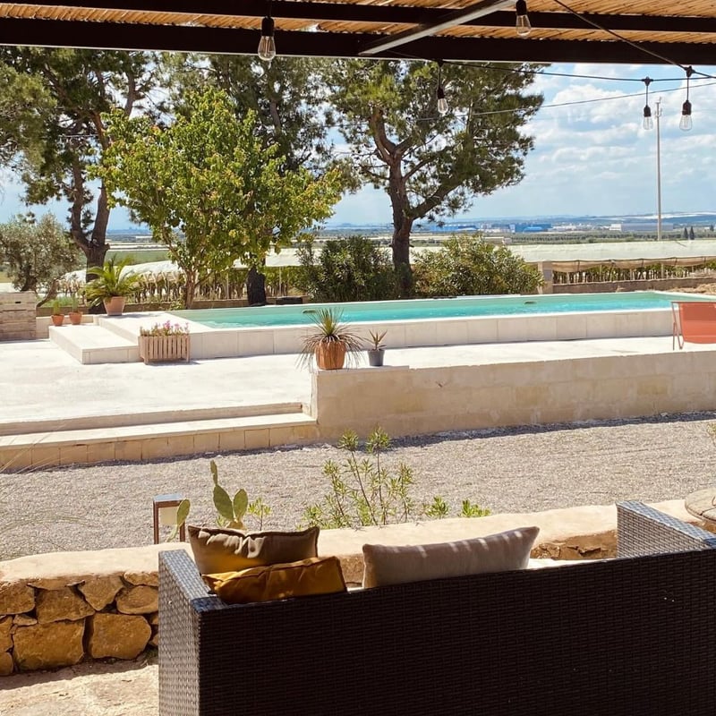 Terracotta walls and coral-hued courtyards define this intimate eight-room masseria, where arched doorways open onto olive groves stretching toward the Puglian horizon. Barrel-vaulted ceilings and thick stone walls keep rooms cool and quiet, while the pool lies shaded beneath umbrella pines. Evenings gather around an outdoor fireplace; mornings bring yoga on the terrace and local cheeses at breakfast.