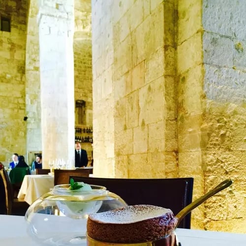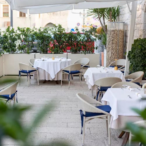 Four brothers run this Michelin-starred seafood restaurant facing Trani's Swabian castle, with chef Stefano Di Gennaro at the stove. The historic dining rooms occupy two levels of period stone walls, while a panoramic terrace captures views of the cathedral's celebrated bell tower. Di Gennaro's cooking favors substance over flourish, reinterpreting Italian classics through Apulian ingredients with confident restraint. An intimate wine cellar offers dining among the bottles.