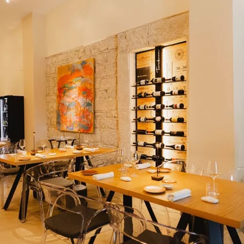 Vaulted ceilings and pale stone walls set a refined yet relaxed tone at this Michelin-recognized address near Trani's harbor. The kitchen turns Puglian tradition into something sharper: codfish mantecato arrives with walnut bread and caper mayonnaise, while a risotto pairs local hairy mussels with Foggia pecorino. Modern technique, regional soul, and an easy warmth from the owners define every meal.