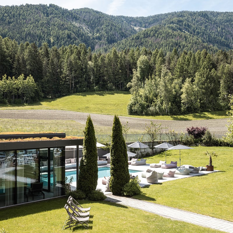 Geometric architecture frames the indoor and outdoor pools at this 50-room South Tyrolean retreat, where sleek new suites showcase blonde wood and crisp white minimalism. Every room opens onto a private balcony facing the Dolomites through floor-to-ceiling windows. The wellness circuit includes saunas, steam baths, Turkish bath, and jacuzzi, while breakfast features house-made spreads and organic produce grown on the property.