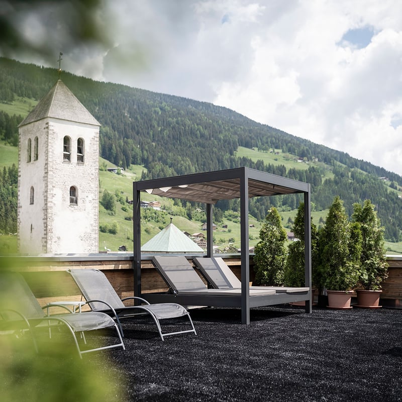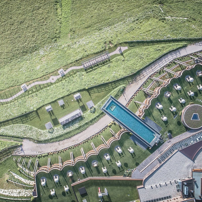 Dramatic Dolomite peaks frame every angle of this contemporary Alpine retreat, from the cantilevered Sky Pool suspended above the valley to the expansive terraces wrapping its 74 rooms. The spa complex encompasses Turkish bath, saunas, and both indoor and outdoor pools, while the restaurant pairs mountain heartiness with Mediterranean lightness. A polished base for ski adventures and summer expeditions alike.