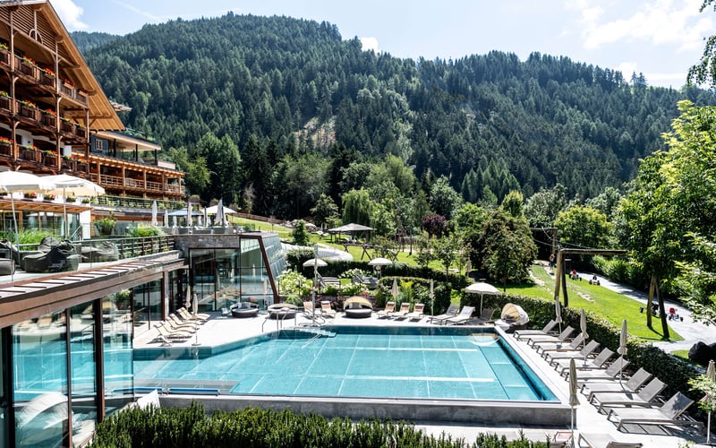 Between the Dolomites and Riesenferners, this 69-room Alpine resort delivers wellness on an ambitious scale: eight pools including a rooftop infinity edge, twelve saunas, hot spring baths, and treatments spanning relaxation to medical-grade therapies. The architecture walks a careful line between contemporary boutique cool and traditional mountain lodge warmth. Kitchens serve hearty South Tyrolean dishes alongside Mediterranean preparations—fuel for days spent in the surrounding peaks.
