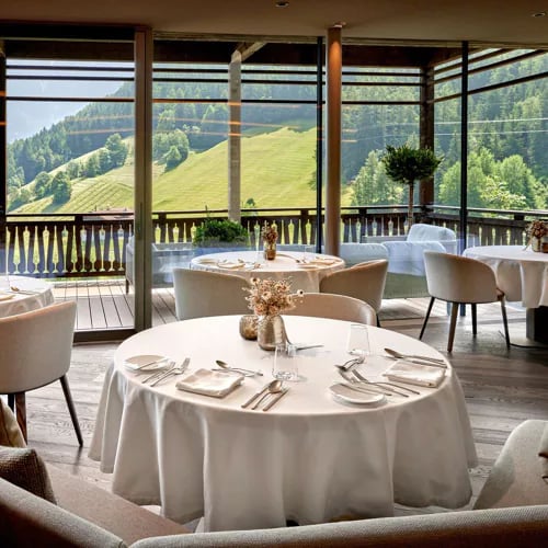 Chef Tina Marcelli's return to Valle Aurina brings fermentation-driven cuisine rooted in zero-waste principles and deep local ties—her sister and uncle among the supplying farmers. Two tasting paths await: the introspective 'About TM' in five or seven courses, or 'La Cucina di casa,' a four-course daily-changing homage to family cooking. Floor-to-ceiling windows frame the Dolomites while Marcelli herself presents plates in the intimate, contemporary dining room. Michelin Green Star.
