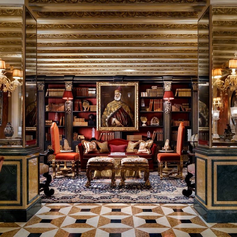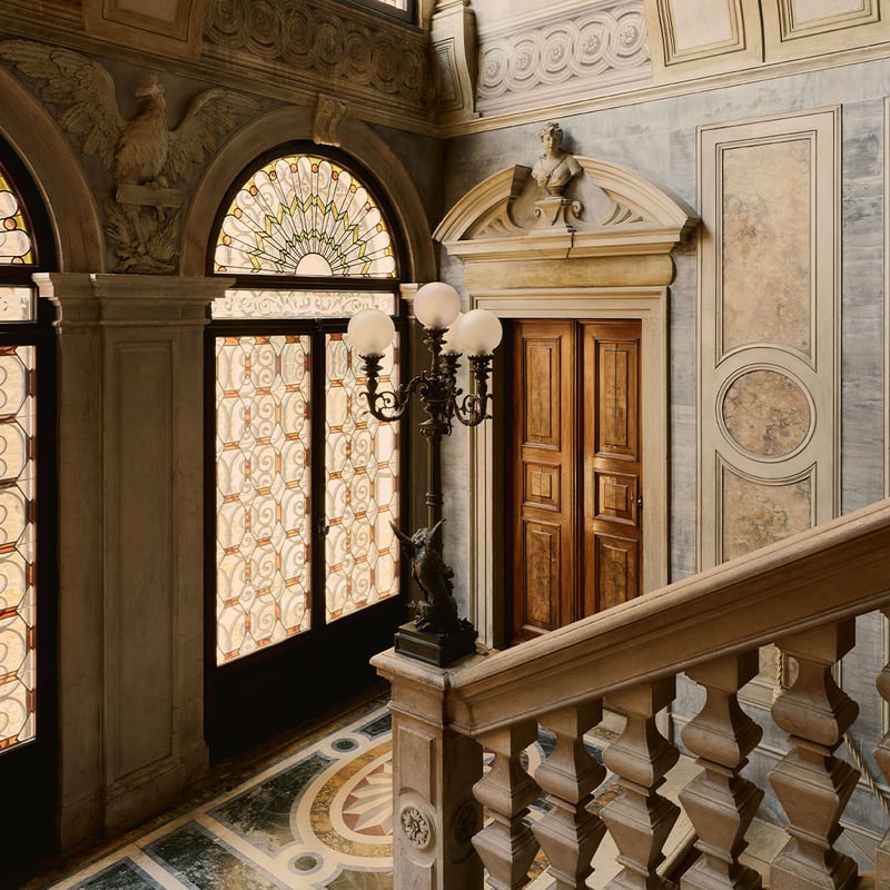 Venice's former stock exchange now hosts this 43-room property from the Evok Collection, the Parisian group behind Brach and Cour des Vosges. Art Deco lines, saturated hues, and Venetian glass infuse interiors that merge French savoir-faire with local craft. Breakfast unfolds in the original trading hall, while a gold-mosaic spa bath perches in the eaves. The courtyard bistro and rooftop pool suit travellers seeking refined design steps from Ferragamo and Armani.
