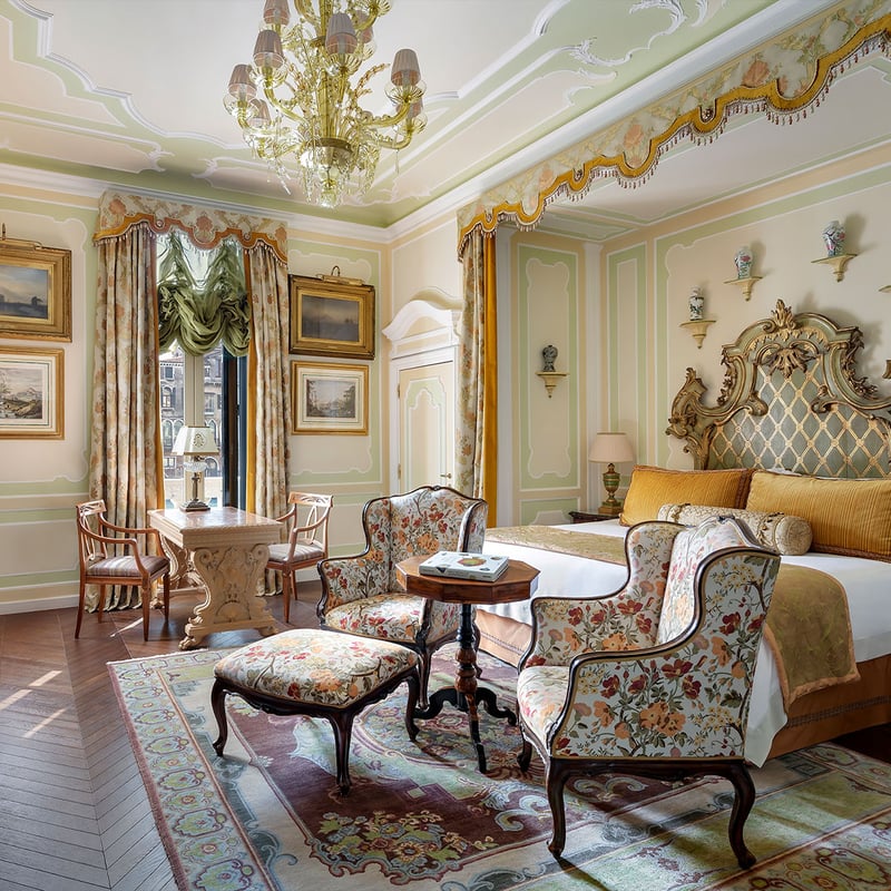 Palazzo Papadopoli's 16th-century Renaissance interiors house Aman's 24-room Venetian outpost, where Giambattista Tiepolo ceiling frescoes and Murano glass chandeliers meet Jean-Michel Gathy's contemporary design. The Grand Canal's only hotel garden spans 2,800 square feet of manicured lawn for dining from April through October. Restaurant Arva serves lagoon-sourced eel, handmade chestnut-flour pasta, and venison foraged from regional farms. George and Amal Clooney held their 2014 wedding reception here.