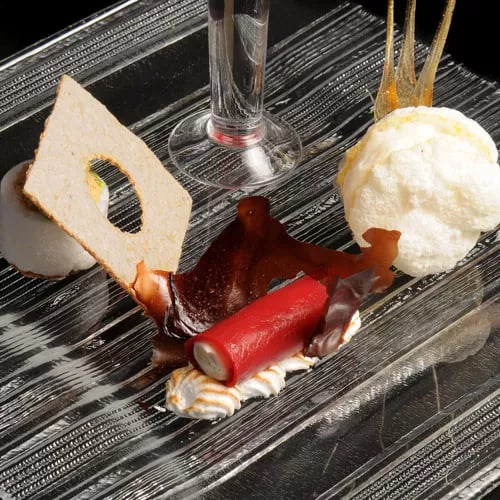 Chef Giuliano Baldessari's one-starred kitchen in Barbarano Vicentino offers two distinct paths: tasting menus built around provocative, pared-back compositions, or an à la carte celebrating the generous flavors of 1980s Italian cooking, each dish arriving with an array of small bowls for accompaniment. The latter unfolds amid vintage tableware and period chairs, while colored light effects play across the dining room—a playful, theatrical approach to Venetian gastronomy.