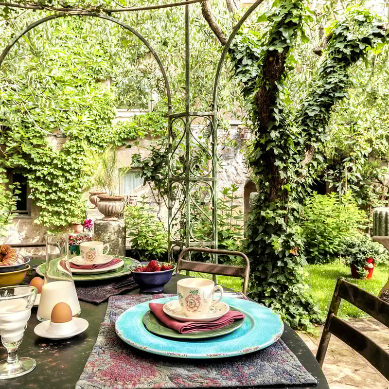 The bishop fled Civita di Bagnoregio after the 1685 earthquake, leaving behind his residence and seminary—now a five-room guesthouse where frescoed ceilings, antique furnishings, and a theatrical 19th-century headboard set the tone. Mornings unfold beneath a towering fig tree; evenings bring local wine and cheese by candlelight in the old winery, or piano music drifting from the cellar. Ideal for romantics seeking atmospheric seclusion near Rome.