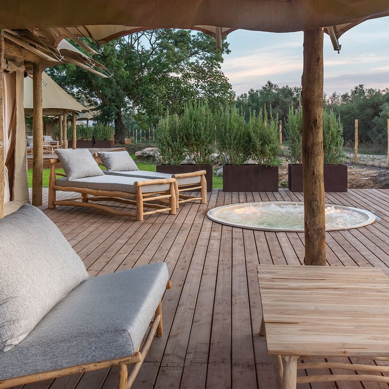 Safari-style tents with clean Italian design replace colonial clichés at this Maremma glamping retreat, where four natural thermal pools—each a different color and temperature—feed into curative bathing rituals. The spring-fed spa draws on Vulca products from Lake Bolsena, while two-bedroom tents include private spa baths. A restaurant showcases hyper-local seasonal cooking paired with an extensive cellar, suited to travelers seeking thermal wellness without sacrificing comfort.
