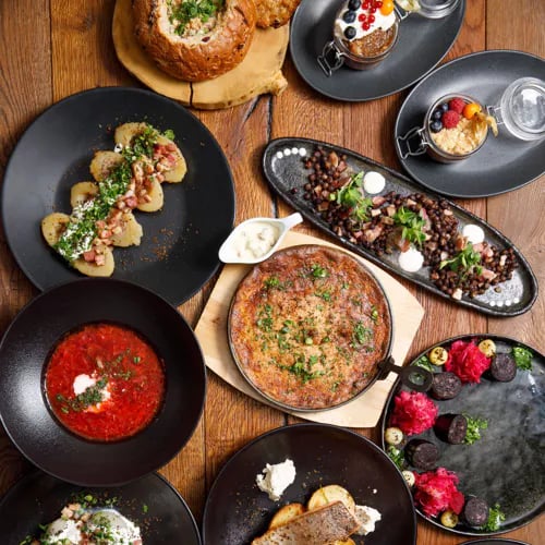 A cocktail at the bar sets the tone before settling into this chic Riga brasserie's leather banquettes. The kitchen runs a confident French playbook—oysters, tartare, burrata—but the real draw is prime beef sourced from the Netherlands, UK, and USA, with sharing cuts commanding the most attention. Game dishes and seasonal specials round out a menu built for lingering evenings.