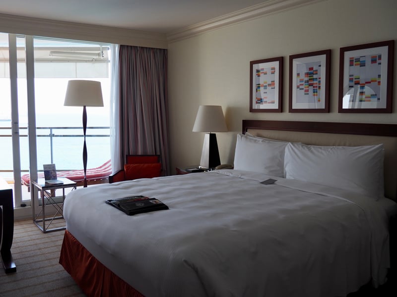 Next we explore our Deluxe Sea View room. Comfortable and spacious at 35 m², it offers a private balcony with a beautiful view of the sea, allowing us to admire the yachts below. All at once we can enjoy the peacefulness of the sea while remaining close to the action in Monte Carlo. A perfect compromise! As for the bathroom, it could do with a little remodeling to keep up with current styles.