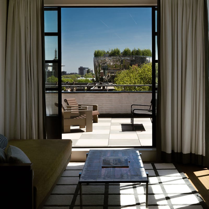 Sharp design meets circular thinking at this 209-room address just off Witte de Withstraat. Cork walls, terrazzo crafted from offcuts, and reclaimed furniture signal a low-impact ethos, while terracotta-toned rooms with micro-terrariums bring an earthy calm. The U Bar, Mind Gym, and creative workspaces draw neighborhood regulars alongside guests—a conscious urban base for travelers who want style without excess.