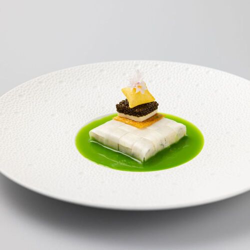 Behind the white 3D wall framing Amarone's open kitchen, chef Jan van Dobben orchestrates a dialogue between classical technique and Japanese sensibility. Wagyu meets umeboshi; hamachi gains brightness from rice-vinegar vinaigrette; venison arrives with a star anise-infused jus of remarkable depth. Sommelier Yoshiko guides the wine selection with precision, her recommendations sharpening each course. One Michelin star confirms the finesse.