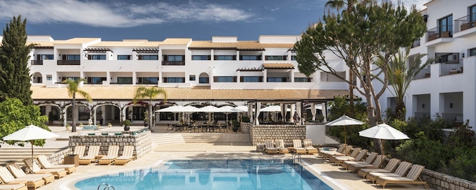 Dramatic red-orange cliffs frame this 178-acre resort, where a glass elevator descends to Praia da Falésia's golden sands. Hand-painted azulejo tiles and Moorish courtyards define the Portuguese aesthetic, while the Serenity spa offers thirteen treatment rooms with Himalayan salt saunas and hydrotherapy circuits. Families gravitate toward the two-acre Porto Pirata complex and Annabel Croft Tennis Academy; couples seek the nine-hole clifftop course and evening dining across fifteen venues.