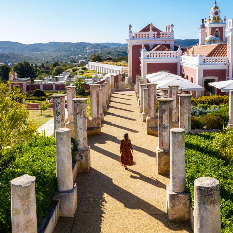 Twelve kilometers inland from Faro, architect Gonçalo Byrne's restoration of this Rococo palace plays 18th-century frescoes and chandeliers against deliberately stark contemporary furniture—a visual tension that rewards close attention. All 63 rooms open onto private balconies surveying Versailles-style gardens where Roman ruins emerge among the greenery. The spa circuit includes Turkish bath, sauna, and jacuzzi; twin pools serve summer and winter swimmers alike.