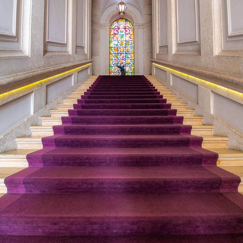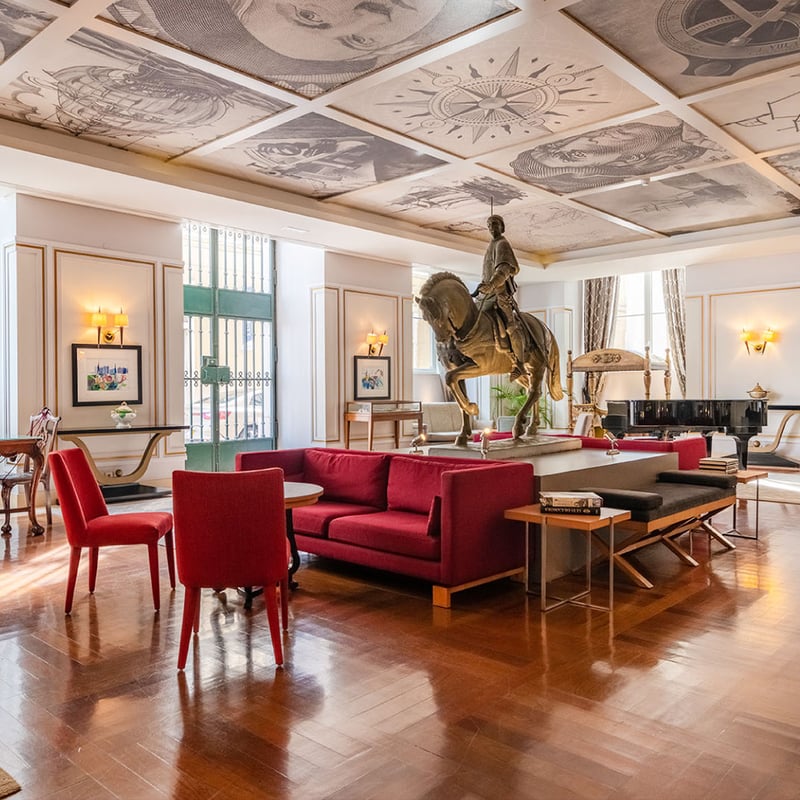 A former government ministry building anchors Praça do Comércio's waterfront, its canary-yellow façade giving way to interiors by architect Jaime Morais—candelabras, carved headboards, and museum-loaned artwork throughout ninety rooms. The Dom Pérignon Suite crowns the property with Irish green marble and dual balconies over the Tagus. Downstairs, RIB Beef & Wine dry-ages tomahawk steaks for terrace dining, while an indoor pool and spa await between explorations.