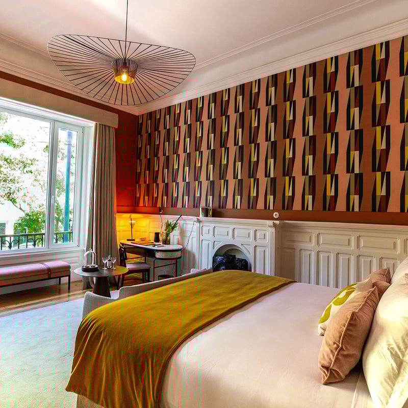 Behind a discreet door on Avenida da Liberdade lies a townhouse-inspired boutique with 48 rooms draped in moody palettes and retro furnishings. Portuguese artisanship—handmade porcelain, gilded landscape paintings, Moorish woodwork—fills the sultry living room, while a sheltered patio with pool offers refuge from boulevard traffic. The Suite Valverde pairs vintage red-and-turquoise décor with a porthole window framing Lisbon's terracotta rooftops; upstairs, a rooftop plunge pool crowns the address.