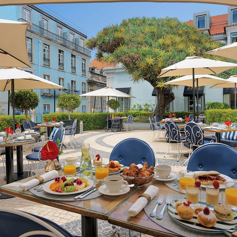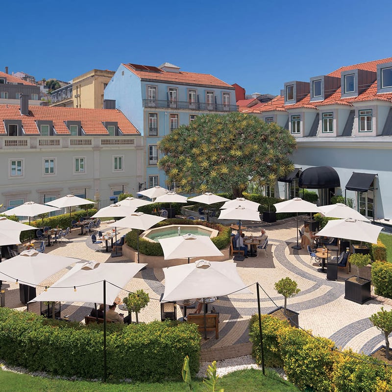 This 18th-century palace on Praça Luís de Camões preserves its Pombaline façade and the legacy of the Grand Hôtel de l'Europe. Pritzker laureate Eduardo Souto Moura's 2018 restoration weaves contemporary Portuguese art—including Rui Chafes sculptures—through 87 rooms. The fifth-floor BAHR restaurant showcases Michelin-starred chef Nuno Mendes's menu, while the rooftop terrace frames Tagus views. A Susanne Kaufmann spa and sauna complete the wellness offering for design-conscious travellers.