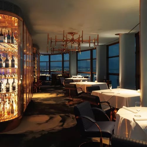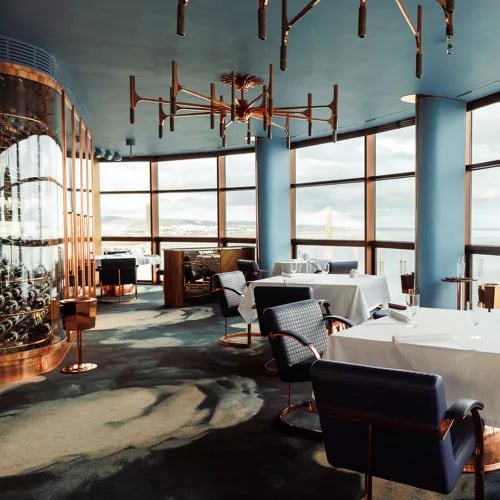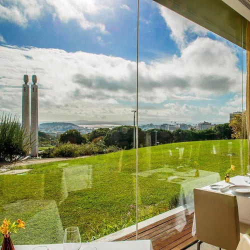 A panoramic lift climbs the Vasco da Gama tower for exactly fifty seconds before delivering diners to Rui Silvestre's elevated dining room, 120 metres above Lisbon with sweeping views across the Tagus and Troia peninsula. The youngest Portuguese chef to earn a Michelin star, Silvestre presents a single 'Fauna and Flora' menu in ten, twelve or fourteen courses, combining local produce with spices and citrus—octopus and beet arrive with yogurt-herb and massala sauces, alongside garlic-butter nan.