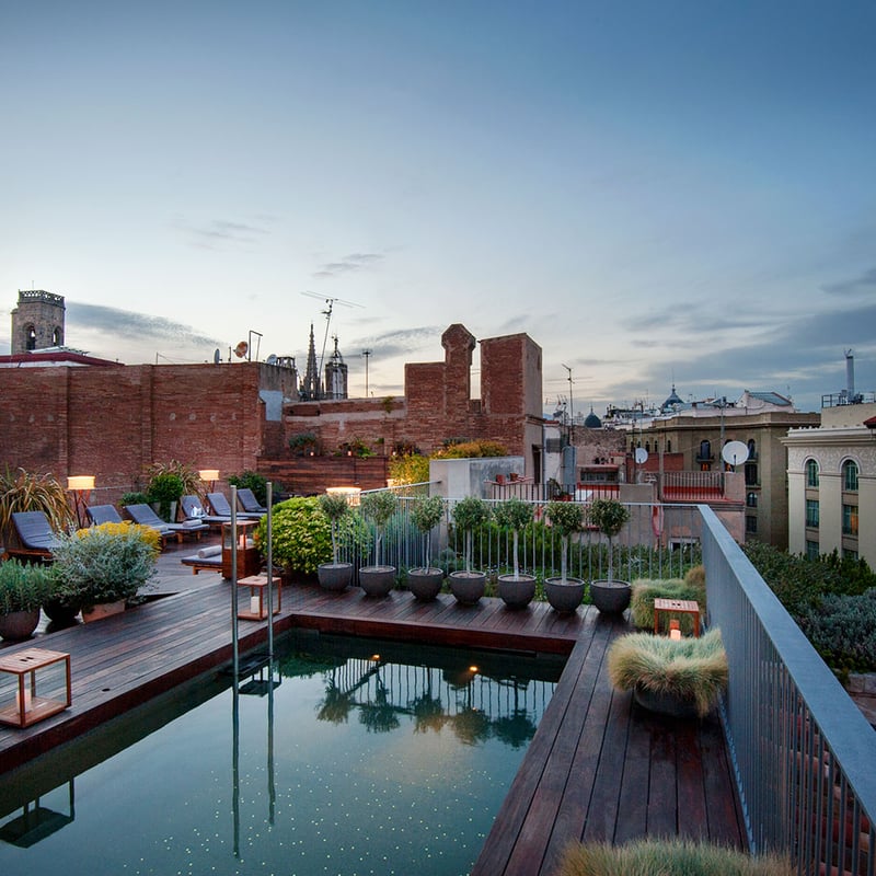 Behind an unmarked door in the Gothic Quarter's labyrinthine alleys, this 22-room adults-only retreat enforces a strict no-photography policy, cultivating an atmosphere of deliberate secrecy. The ground floor channels a Mayfair private club—wood-paneled walls, red velvet seating, a crackling fireplace—while upstairs, rooms feature botanical wallpaper and Marshall speakers. The rooftop terrace and outdoor pool offer sunset views over Barcelona's medieval skyline.