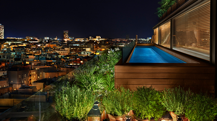A striking 19th-century building off Passeig de Gràcia, Almanac Barcelona channels Art Deco through mid-century modernism in interiors by Jaime Beriestain. The rooftop dominates the experience: a swimming pool flanked by panoramic city views, Azimuth restaurant serving amid the skyline, sauna and steam rooms below. Ground-floor Virens caters to plant-based dining. The crowd skews young, moneyed, and photogenic.